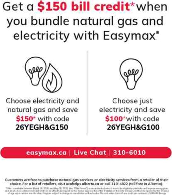 Get a $150 bill credit* when you bundle natural gas and electricity with Easymax. Details of the offer can be found in the images below.