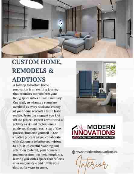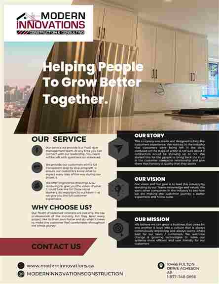 Modern Innovations Construction and Consulting is an incredible home remodeling company located in Edmonton and serving Edmonton and area.Instead of organizing your renovation and chasing multiple contracts, let us become your renovation broker. Our team of certified, and experienced contracts will bring your vision to life. From vision to completion, our team is with you every step of the way to ensure that your project is delivered on time, and on budget. We pride ourselves on offering a personal, unique service like no other.